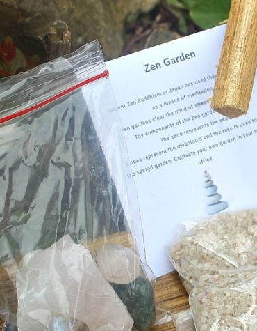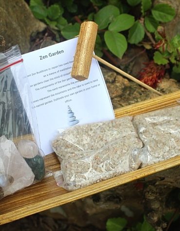 Zen garden consists of: A bamboo tray, a rake, 4 bags of stones, a raw Rose Quartz crystal & a few tumble stones.