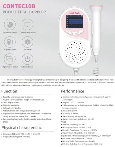CONTEC10B Pocket Fetal Doppler adopts Doppler technology in designing, it is a hand-held fetal heart rate detection device. Measured FHR value and waveform are displayed on the LCD screen. With easy and convenient operation, it can be used in hospital, clinic for daily self-check by pregnant woman, realizing early monitoring and care for life.
